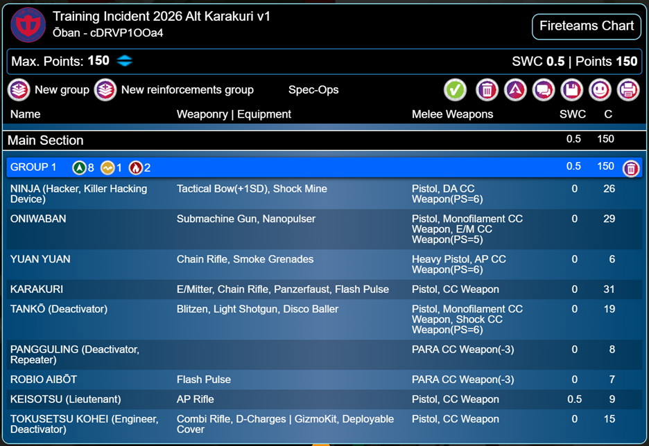Very similar to the first list, but we dropped the Domaru, the sensor bot, and the Ryuken to fit in the Karakuri, an engineer, and a Keisotsu Lieutenant. It still feels very anemic on firepower, especially lethal firepower, but I’m hoping the durability is generally better and the engineer gives me the ability to score the bonus objective. We’re probably still very reliant on the asymmetric problem-solving that the Oniwaban provides.