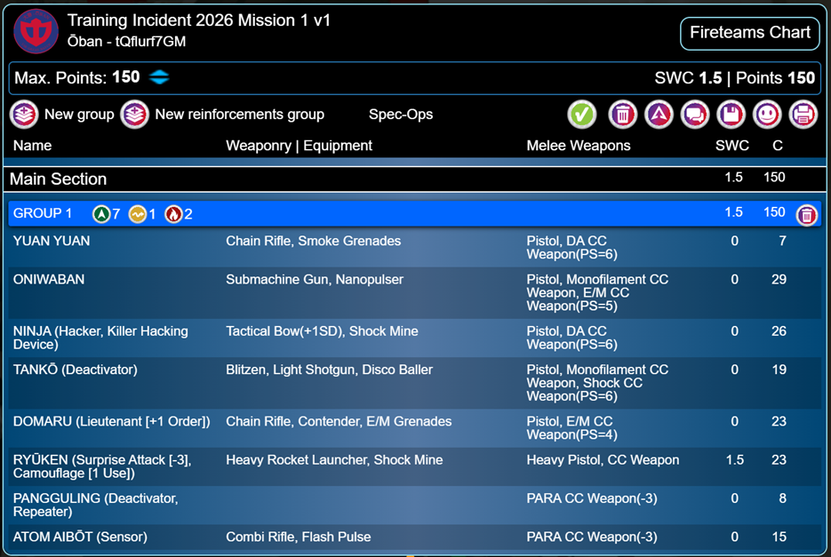 Like I said above, the Oniwaban is probably my reserve drop, and we fervently hope he doesn’t manage to fail the infiltration roll. Though even if he does, a lot of the table may just be empty at a 150 points. It may take him an entire round and a half to get back into position, but I consider it likely that he’d be able to. Unlike a Shikami, the Oniwaban isn’t a specialist, so his only role is murder. If my opponent is a veteran player, then I don’t feel bad about going straight for a decapitation strike if I can (or if I happen to stumble on one). If my opponent is newer, then maybe we don’t do that on Turn 1. After all, this league is to encourage new players to come back.